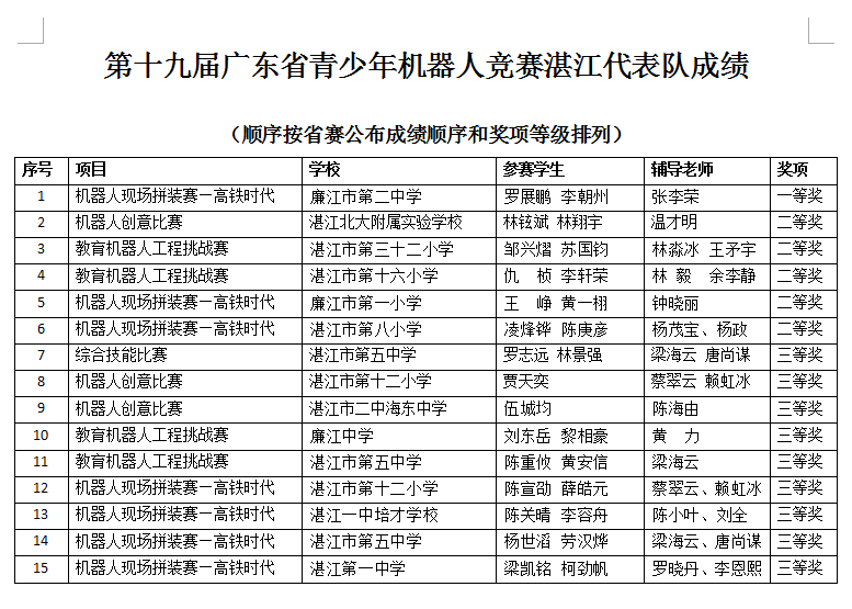 近年来,市科协和市科普中心不断加大青少年机器人工作力度,今年为备战省赛,还举行了2019年湛江市青少年机器人竞赛,获得广大师生、学校、有关单位的大力支持和赞扬。本次大赛取得的成绩,充分展示了近年来湛江市青少年科技教育工作取得的成效,也展示了我市青少年学生热爱科学、勇于创新的精神风貌。希望获奖师生再接再励,越战越勇,在竞赛中不断学习,取得更多的收获。