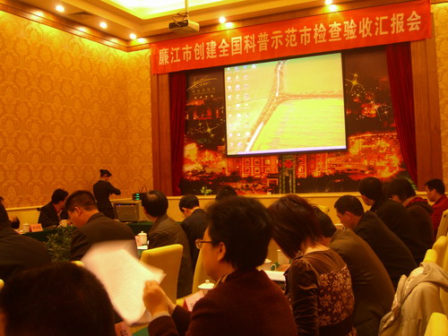在验收汇报会上,省检查验收组观看了廉江市《共谱科普工作新篇章》专题片,并听取廉江市罗岗副市长代表廉江市人民政府作“落实全民科学素质纲要,服务经济社会发展”创建全国科普示范县(市)的工作汇报,廉江市委办、市府办、组织、宣传、科技、教育、发改、财政、劳动、卫生、农业、工青妇等部门负责人出席汇报会。