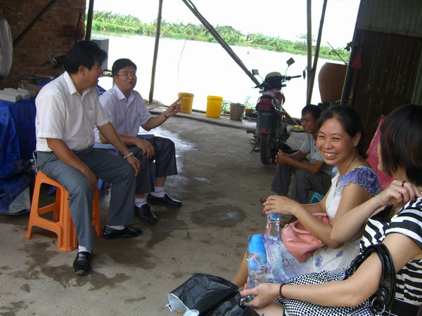 随后,在吴川市科协主席梁河清等领导的陪同下,马不停蹄地赶到科普惠农田间地头进行调研,考察了吴川科普示范基地养殖场,与科普养殖示范户进行了交流,听取他们采取鸭-猪-鱼-香蕉立体种养的科学养殖方法和取得实效经验介绍。肖斌一行边听边记边问边了解情况。