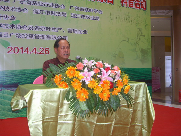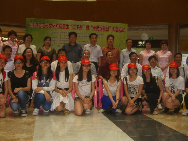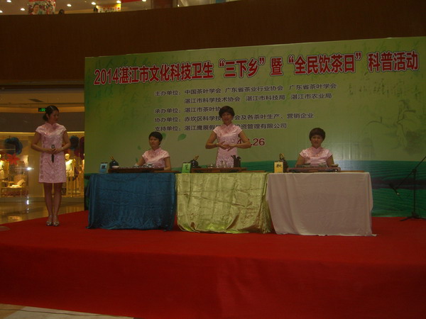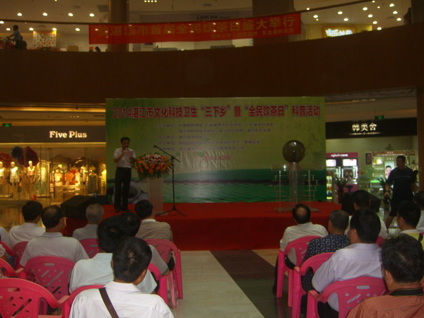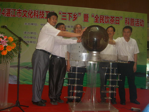 4月26日上午,由湛江市科协、中国茶叶学会、广东省茶业行业协会、广东省茶叶学会、湛江市科技局、湛江市农业局主办,湛江市茶叶协会承办的2014全民饮茶日科普活动在湛江鹰展假日广场举行,原湛江市副市长植标志、湛江市农业局局长罗辉、湛江市科协主席肖斌、湛江市科技局副局长陈祥胜、省茶业行业协会副会长李裕南按动水晶球启动2014文化科技卫生“三下乡”暨全民饮茶日科普活动。