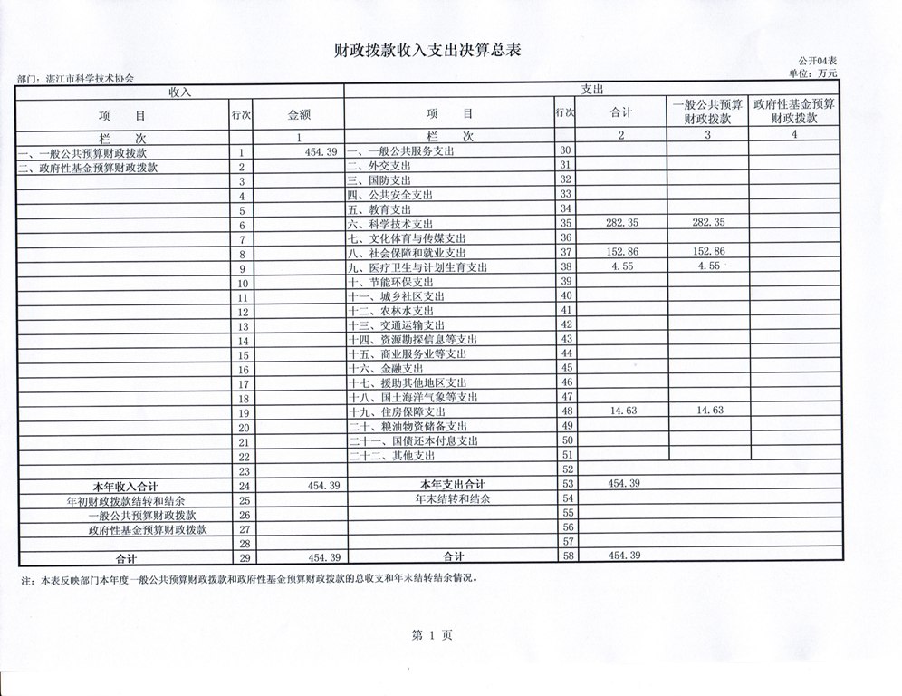 2014年湛江市科协财政拨款收入支出决算表